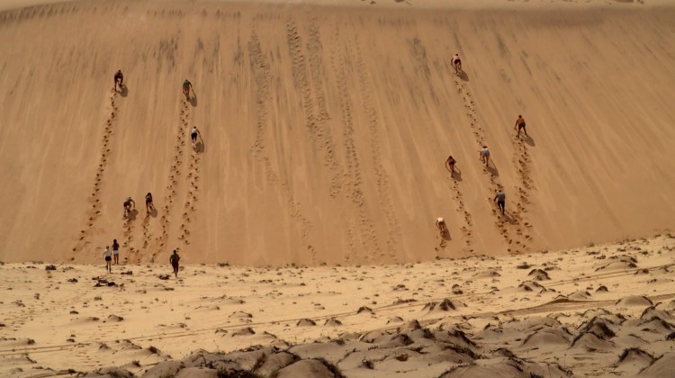 Para conquistar o acampamento vip e ter mais itens de sobrevivência, os participantes passam pelo primeiro desafio: “Ele começa naquela duna. Vocês vão ter que pegar a bandana que representa a tribo de vocês e quando os oito chegarem aqui, vão pegar a bandeira da tribo e ir em direção ao mar”, avisa o apresentador.